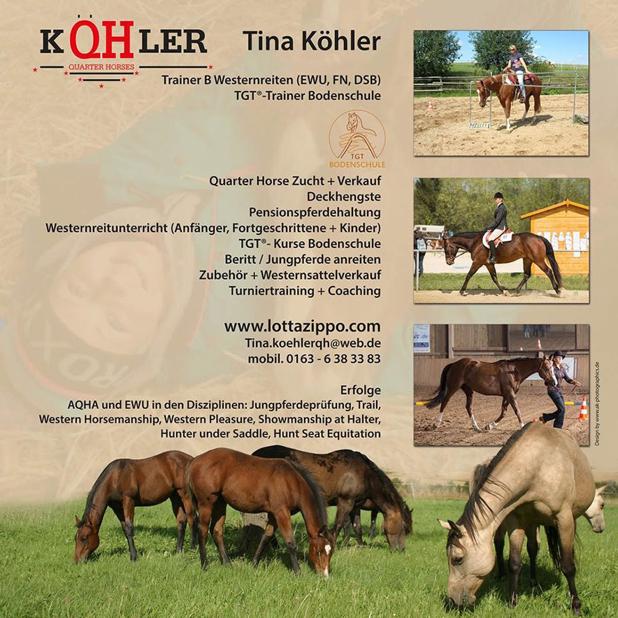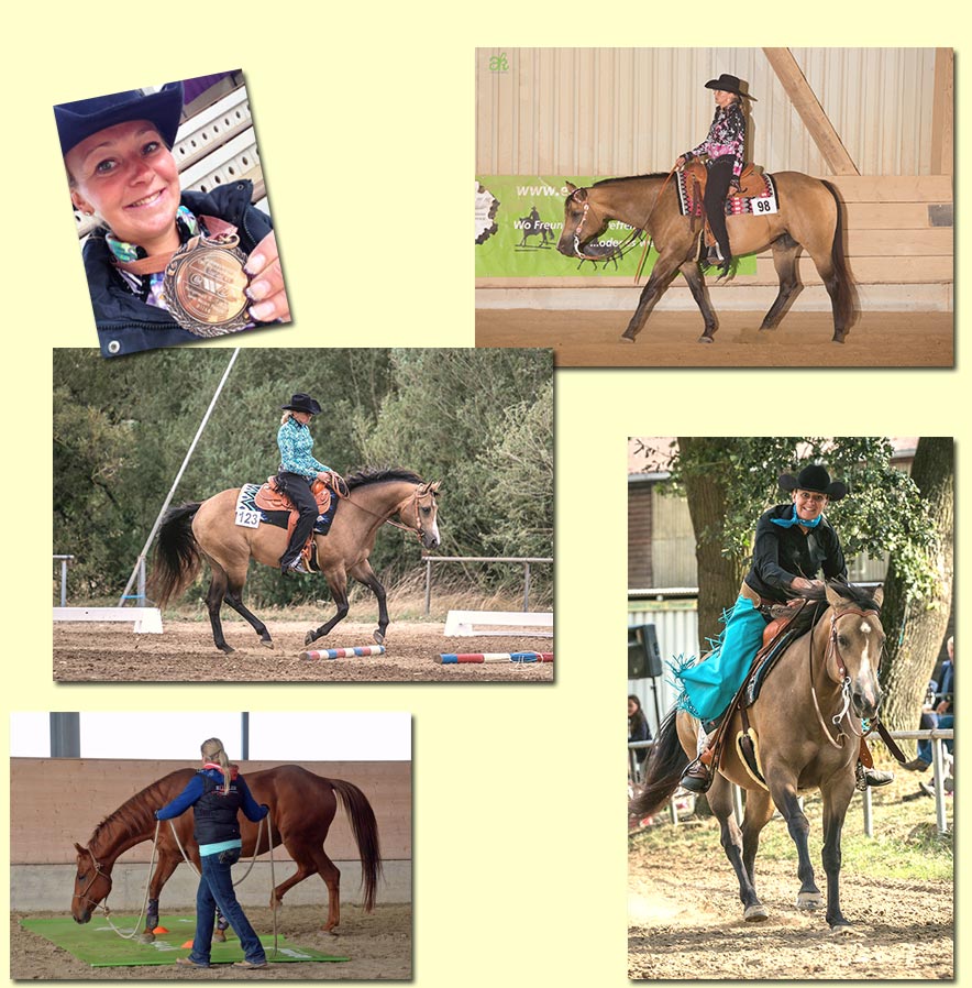 Mittlerweile startet Tina erfolgreich auf EWU Turnieren in den Disziplinen Showmanship, Horsemanship, Pleasure, Trail, Jungpferdeklassen und Ranch Riding. Die Pferde sind entweder aus unserer Zucht und/oder Kundenpferde.